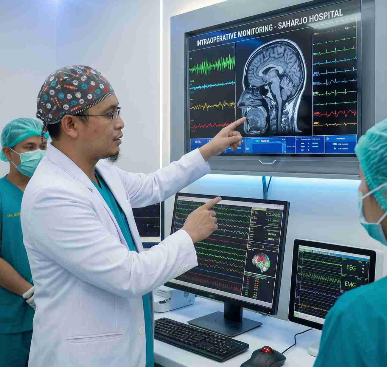 Pemantauan Saraf Real-Time (Intraoperative Monitoring / IOM) adalah teknologi yang memantau aktivitas saraf secara real-time selama operasi. Dengan ini, dokter dapat memastikan saraf tetap aman dan terlindungi, sehingga prosedur menjadi lebih aman dan terkontrol.